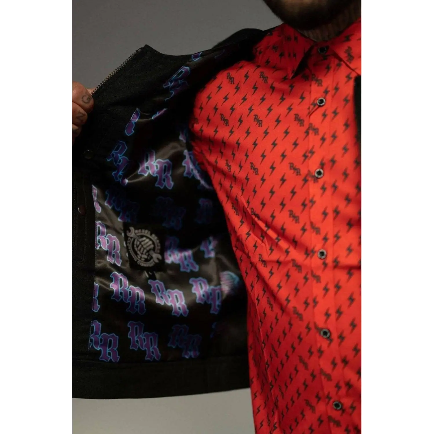 The Covert Vest Black Denim center showcases an exposed heavy-duty 2-way YKK zipper, enhancing its rugged aesthetic. However, what truly distinguishes this vest is the custom 3-panel Rebel Reaper neon eagle/RR bolt flash liner. It features dual conceal carry pockets and holsters. The vest is equipped with heavy-duty YKK zippers and snaps/hardware, ensuring its durability and longevity.